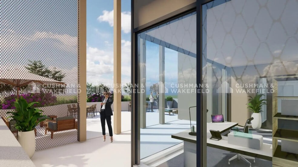 L’étage se situe au sein d’un immeuble de bureaux actuellement en construction, conçu pour offrir des espaces de travail lumineux et modulables. Les aménagements prévus permettent une organisation flexible, adaptée aussi bien à des postes individuels qu’à des configurations collaboratives. Les larges ouvertures apportent une belle qualité de lumière naturelle et s’ouvrent sur une terrasse privative paysagée, pensée comme un prolongement extérieur de l’espace de travail. L’environnement immédiat est calme, tout en restant facilement accessible grâce à la proximité directe de l’autoroute. Les futurs utilisateurs bénéficieront également des stationnements en sous-sol, intégrés au projet pour renforcer le confort d’accès.