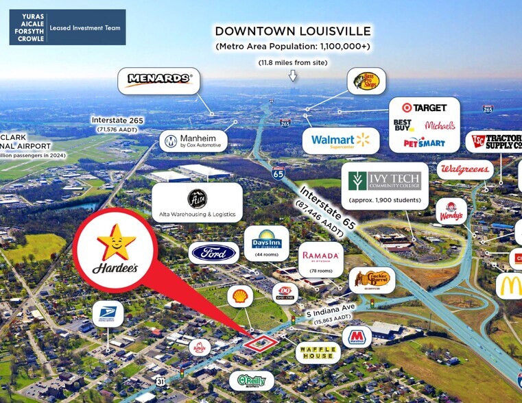 Prime Interstate Access: Located at 240 S Indiana Ave, Sellersburg, IN, just 1,000 feet from I-65’s on/off ramp (87,446 AADT), this Hardee’s benefits from exceptional visibility and traffic flow. The site sits on a key retail corridor with 15,863 AADT on S Indiana Ave, connecting to a broader network of high-traffic roads like County Road 311 (25,637 AADT). Its proximity to Louisville, KY (11.8 miles), amplifies its reach to a major metropolitan market.