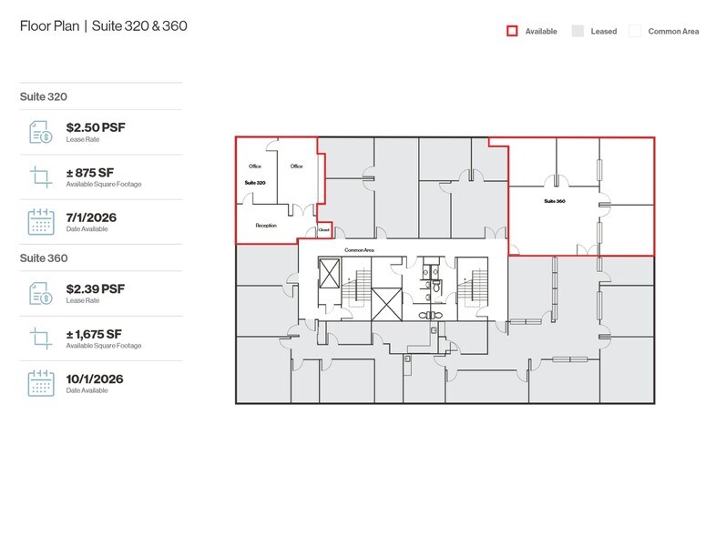 | 3e étage, ste 360 | 1 675 pi² | 2-5 ans | 39,38 $ CAD/pi²/an 3,28 $ CAD/pi²/mois 65 962 $ CAD/an 5 497 $ CAD/mois | Bureau | - | 2026-10-01 |