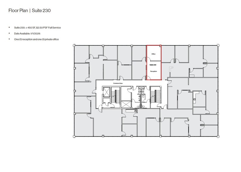 | 2e étage, ste 230 | 450 pi² | 2-5 ans | 41,06 $ CAD/pi²/an 3,42 $ CAD/pi²/mois 18 479 $ CAD/an 1 540 $ CAD/mois | Bureau | construction complète | Maintenant |