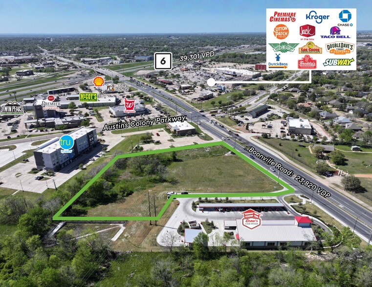Two (2) platted commercial lots with utilities in place, zoning, and off-site detention already provided, ideally positioned between Earl Rudder Freeway (SH 6) and Briarcrest Drive. The lots may be purchased together or separately, offering flexibility for a variety of users and development plans. The property offers over 300 feet of frontage along Boonville Road (FM 158) and features an existing driveway with deceleration lane, multiuse pedestrian path, and median break, allowing full ingress and egress. Conveniently located just 1/4 mile east of SH 6 access, the site is surrounded by major retail, dining, and entertainment options, as well as national hospitality, healthcare, and automotive users. The area is experiencing rapid residential and commercial growth in East Bryan and is approximately one mile from the future H-E-B development on Boonville Road, making it an exceptional opportunity for a wide range of commercial uses.