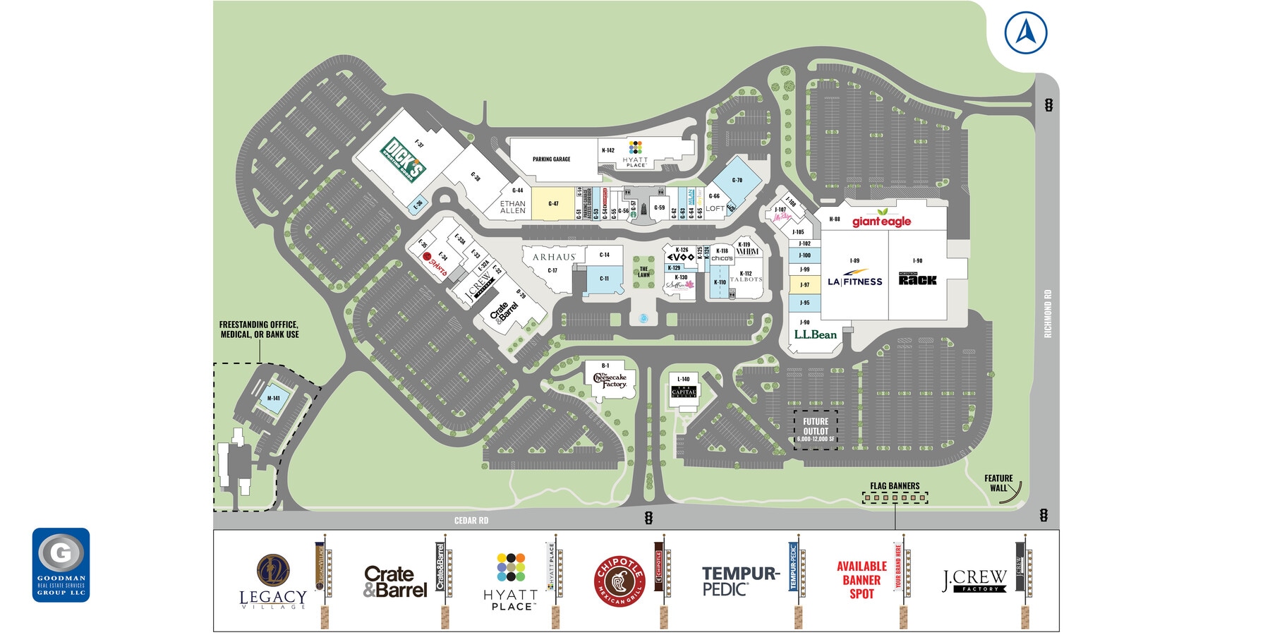 AVAILABLE: 4,116 SF freestanding building with drive-thru lanes on 0.62 AC Lease, ground lease, or build to suit Previously occupied by Fifth Third Bank CLASS B COMMUNITY BUSINESS DISTRICTS Legacy Village has 600,000 square feet of upscale retail and fine restaurants, 20,000 square feet of Class A office, and 135 hotel rooms Join major retailers and restaurants such as The Cheesecake Factory, Arhaus, Lilly Pulitzer, Crate & Barrel, and The Capital Grille that attract 4.3 million visits annually