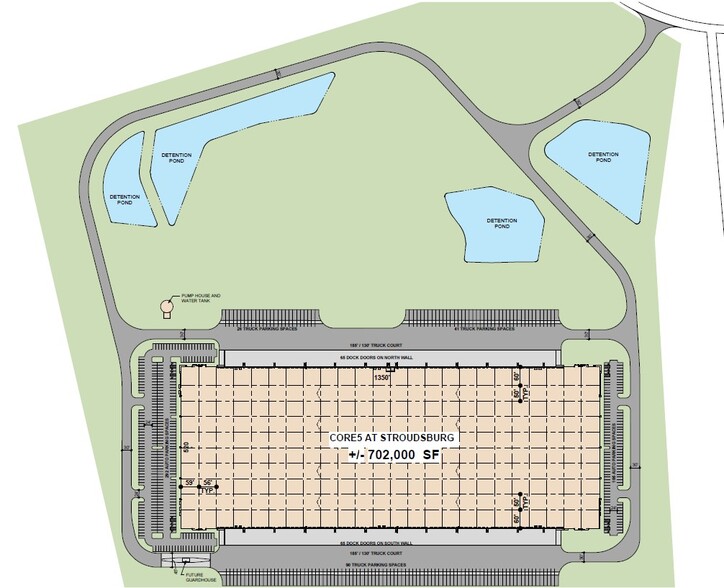 Core5 at Stroudsburg delivers a modern industrial solution strategically positioned within one of the Northeast’s most dynamic logistics corridors. Located at 246 Warner Road in Tannersville, this high-performance facility benefits from immediate, toll-free access to Interstate 80, placing occupiers within straightforward reach of New Jersey, New York City, the Lehigh Valley, and the broader Mid-Atlantic distribution network. The surrounding region offers a deep labor pool, strong industrial employment base, and anticipated LERTA tax incentives, further strengthening operational advantages for high-velocity users. The cross-dock configuration supports exceptional throughput capability, supported by dual-sided loading, deep 185-foot truck courts, and a fully reinforced concrete apron engineered for heavy trailer activity. A robust platform of building systems enhances performance, including 40-foot clear heights, 130 dock-high positions, four drive-in doors, and a 3,000-amp 480/277V electrical service expandable to meet specialized power needs. An ESFR sprinkler system with a dedicated 2,000 GPM fire pump enables efficient, high-density inventory storage while maintaining compliance and operational confidence. The site is designed to support large-scale distribution requirements with 157 trailer stalls and 397 auto parking spaces, ensuring flexibility for fleet parking, workforce volume, and peak demand scenarios. Smooth finish tilt-wall construction, clerestory windows, white-painted interior walls, and mechanical TPO roofing create a durable and energy-efficient environment that supports modern logistics operations. With the added benefit of proximity to major consumer markets and regional transportation hubs, Core5 at Stroudsburg presents a uniquely positioned opportunity for users seeking a scalable, high-capacity distribution platform within the Northeast.