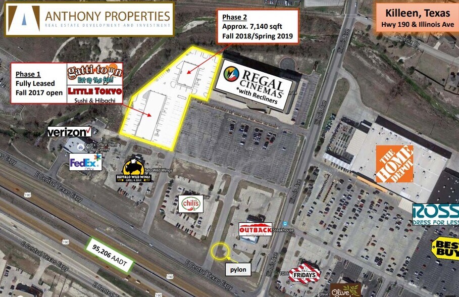 Veuillez composer le 214-432-9506 pour obtenir de plus amples renseignements. Nous louons la phase 2 de notre centre de décapage adjacent au cinéma Regal. La phase 1 est ouverte et comprend un restaurant japonais d'hibachi/sushis de 5 000 pieds carrés (Little Tokyo) et une pizza de 13 009 pieds carrés, des salles d'arcade et des installations de divertissement (M. Gatti). Les plans conceptuels préliminaires de la phase 2 prévoient la construction d'un immeuble de 6 550 pieds carrés. Nous le commercialisons d'abord en tant que deux suites distinctes (4 200 pieds carrés d'espace de restaurant et 2 350 pieds carrés d'espace de vente au détail), mais cela peut être ajusté, au besoin. Le panneau de pylône existant sur la route de façade comporte de l'espace pour les futurs locataires de la phase 2.