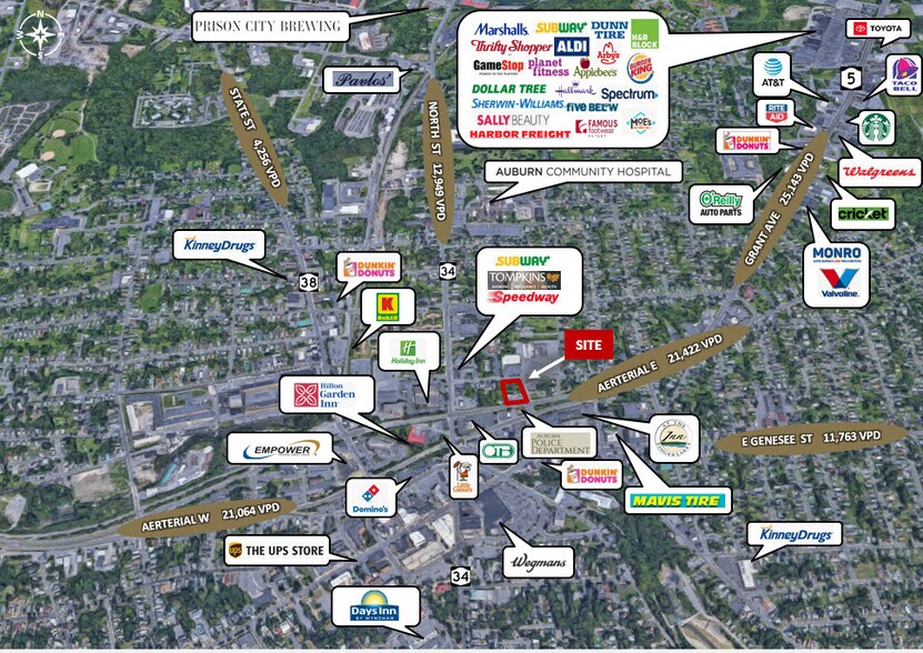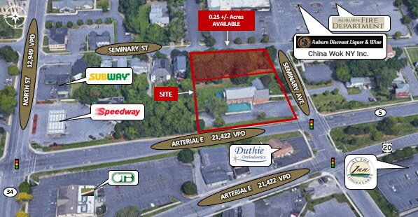 0,25 +/- Acre de terrain vacant à vendre, le terrain devant être subdivisé à partir de la parcelle actuelle de 1,20 acre. Opportunité d'investissement ou de réaménagement de premier plan, demandant 36 000$. Excellent emplacement juste à côté de l'Arterial Highway au cœur d'Auburn avec façade sur les routes 5 et 20. À distance de marche de Wegmans, de The Inn at Finger Lakes, des restaurants locaux et du quartier prospère du centre-ville d'Auburn. District de zonage : D- Centre-ville offrant de multiples utilisations potentielles avec un nombre élevé de trafic de 25 143 VPD sur l'artérielle Est.
