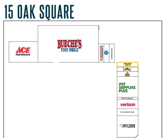 Retail space available in the Bueche’s Food World anchored shopping center. This neighborhood center, located on the busy corner of Ortonville and Oakwood Roads, is home to many national tenants including Ace Hardware, Pet Supplies Plus, Anytime Fitness, Verizon, and more. The center offers multiple routes of access, with ample parking and great roadway visibility. This is a great opportunity to join a well-established shopping center in an area that will continue to grow for many years. 15 Oak Square is the premier retail destination plaza, and offers limited availability.