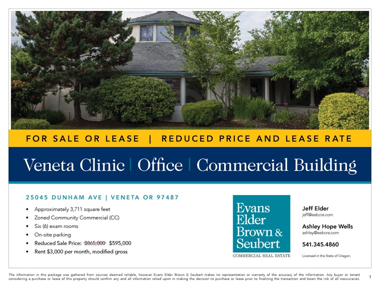 Clinique, commercial ou immeuble de bureaux au centre-ville de Veneta Environ 3 711 pieds carrés Commercial communautaire zoné (CC) Treize (13) places de stationnement sur place Carte fiscale et numéro de lot 17-06-36-14-04600 3 850$ par mois, brut modifié