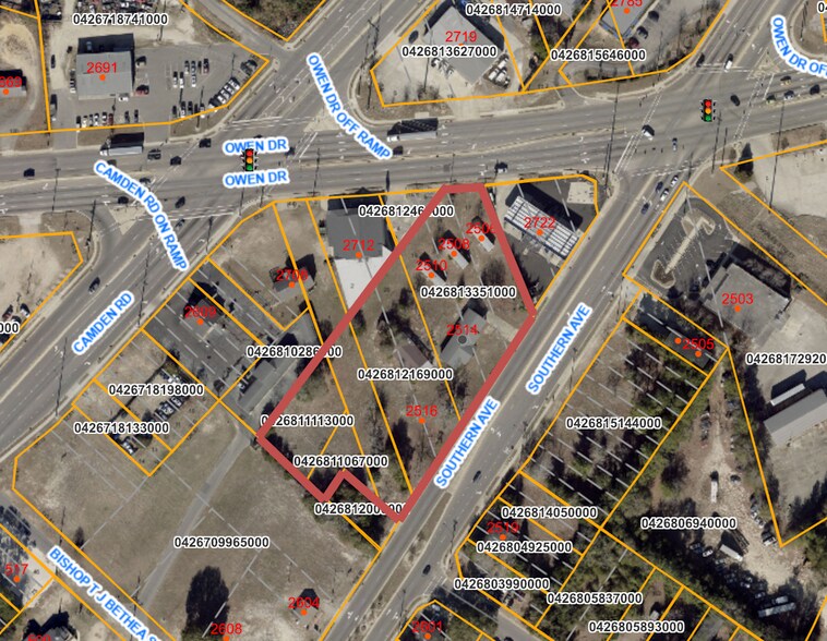 The property features ±55 feet of frontage on Owen Drive with approximately 30,000 vehicles per day, along with an impressive ±363.87 feet of frontage on Southern Ave with 9,800 vehicles per day. Positioned just moments from the signalized intersections of Owen Drive with Southern Ave and Camden Road, the site benefits from strong traffic flow, excellent connectivity, and convenient access to surrounding residential and commercial growth.
