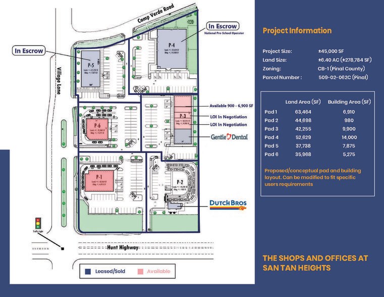 Excellent emplacement au cœur du boom de développement de San Tan Valley (l'un des plus dynamiques du pays) • Site facilement accessible à une intersection avec feux de signalisation sur Hunt Highway • Terrains disponibles à la vente, en bail foncier ou en construction sur mesure • Espaces à louer (Commerce de détail, Bureaux et Usage mixte)