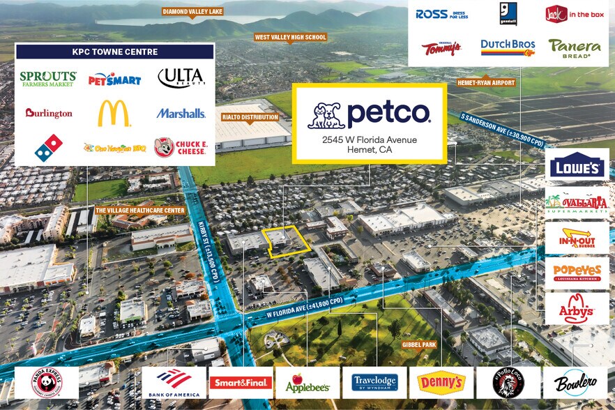 * Dominant Retail Hub Location – Situated directly along W Florida Ave (±41,800 CPD), Hemet’s most dominant retail street, and hub in the immediate trade area, proving the viability of Petco as a retail property and location. In addition to the co-tenants within the shopping center, adjacent retailers include The Home Depot, Target, Lowe’s, Ross Dress for Less, Stater Bros., In-N-Out Burger, Sprouts, Grocery Outlet, Raising Cane’s, McDonald’s, Vallarta Supermarkets, El Pollo Loco, and many other national and regional retailers – this is THE location for retail!
