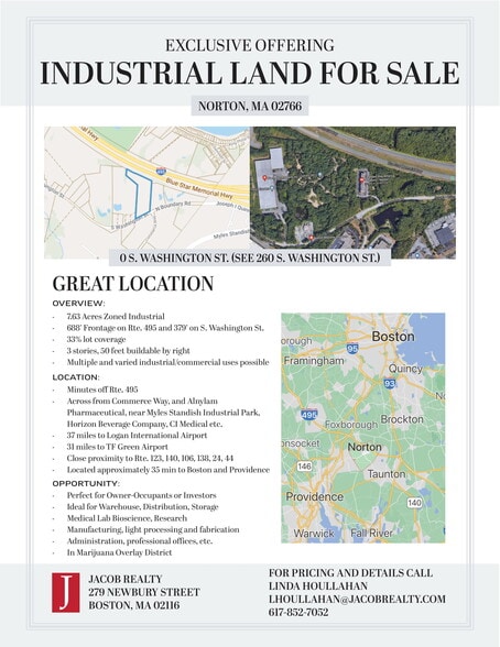 - 7,63 acres zonés industriels - façade de 688 pieds sur la route 495 et 379' sur la rue S. Washington. - 33 % de couverture des lots - 3 étages, 50 pieds constructibles à droite - Utilisations industrielles et commerciales multiples et variées possibles - Panneau d'affichage statique autorisé face à 495 ****