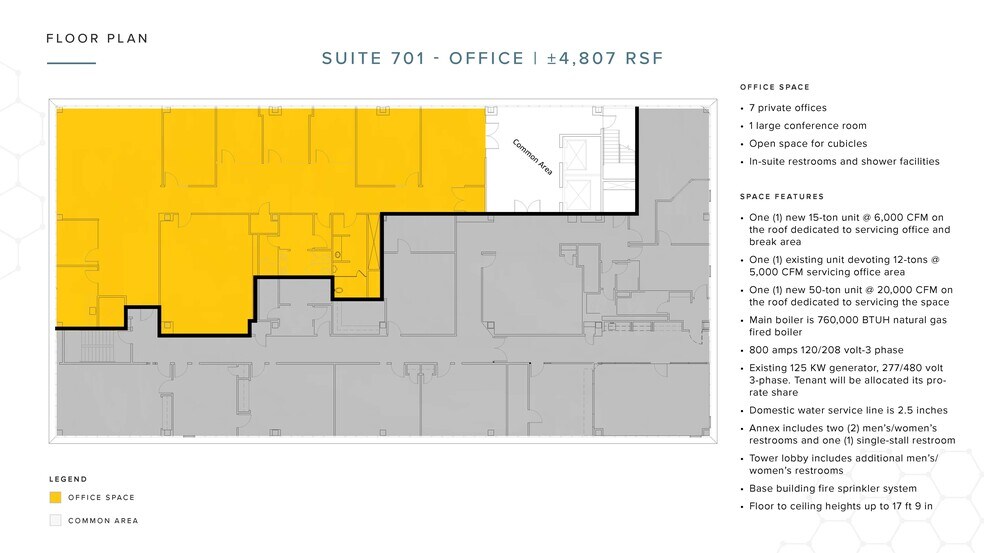 - Annex includes two (2) men’s/women’s restrooms and one (1) single-stall restroom | Tower lobby includes additional men’s/ women’s restrooms