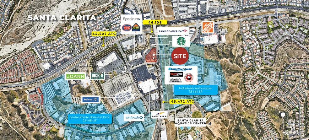 Centre Pointe Marketplace est un centre électrique de 100 000 pi2 situé à côté de l'intersection très fréquentée du chemin Soledad Canyon et du chemin Golden Valley, dans la vallée de Santa Clarita. Ce centre de vente au détail abrite des locataires nationaux voisins tels que Walmart Supercenter, Sam's Club, Dick's Sporting Goods, Joanne's Fabrics, Starbucks, Spectrum, Bank of America, Jersey Mikes, LA Fitness et bien d'autres ! Le Centre Pointe est niché dans le parc d'affaires de 2,5 m de SF Centre Pointe et accueille plus de 30 000 employés dans un rayon de 3 milles. En plus de ce grand auditoire de jour, le site propose de solides démonstrations résidentielles qui comprennent une population de plus de 110 000 habitants et un revenu moyen des ménages de 108 934$ dans le même rayon de 3 milles.
