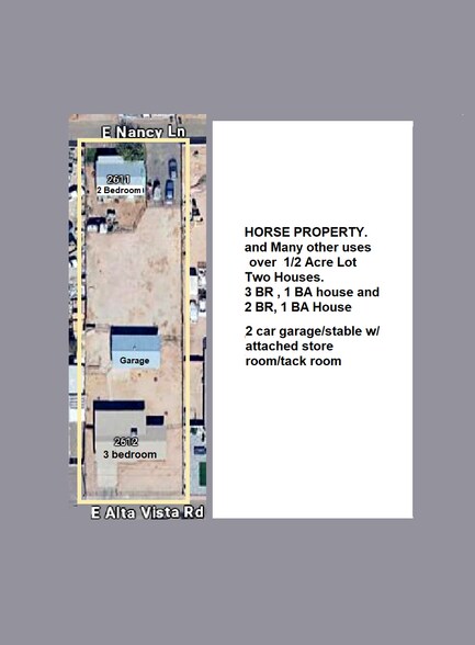 - Over 1/2 acre. Two Houses. 3 BR , 1 BA house and 2 BR, 1 BA House 2 car garage/stable with attached store room/tack room.