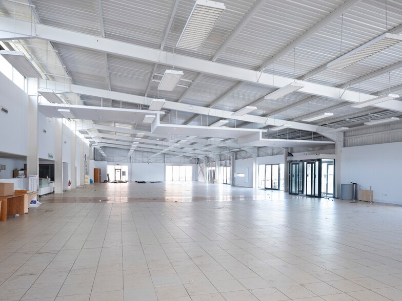 - Modern two-level steel-frame showroom with extensive glazing and multiple vehicle access doors.
