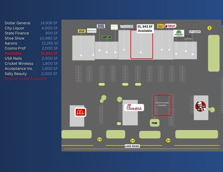 - Available Spaces: 2,000 SF outparcel and 31,843 SF large retail unit