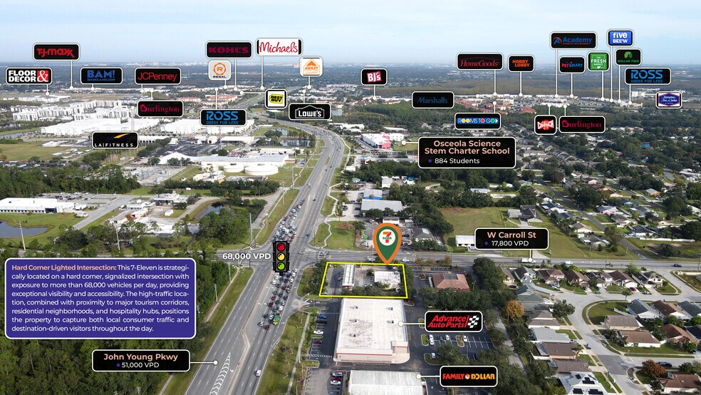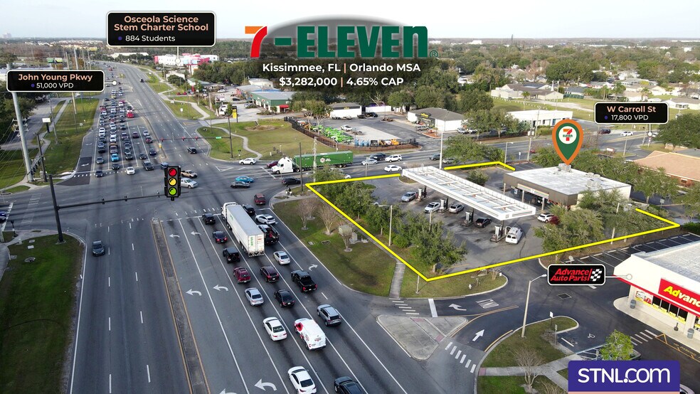 STNL.com is pleased to present this 100% fee simple STNL 7-Eleven in Kissimmee, FL, strategically located on a hard corner lighted intersection that sees over 68,000 cars a