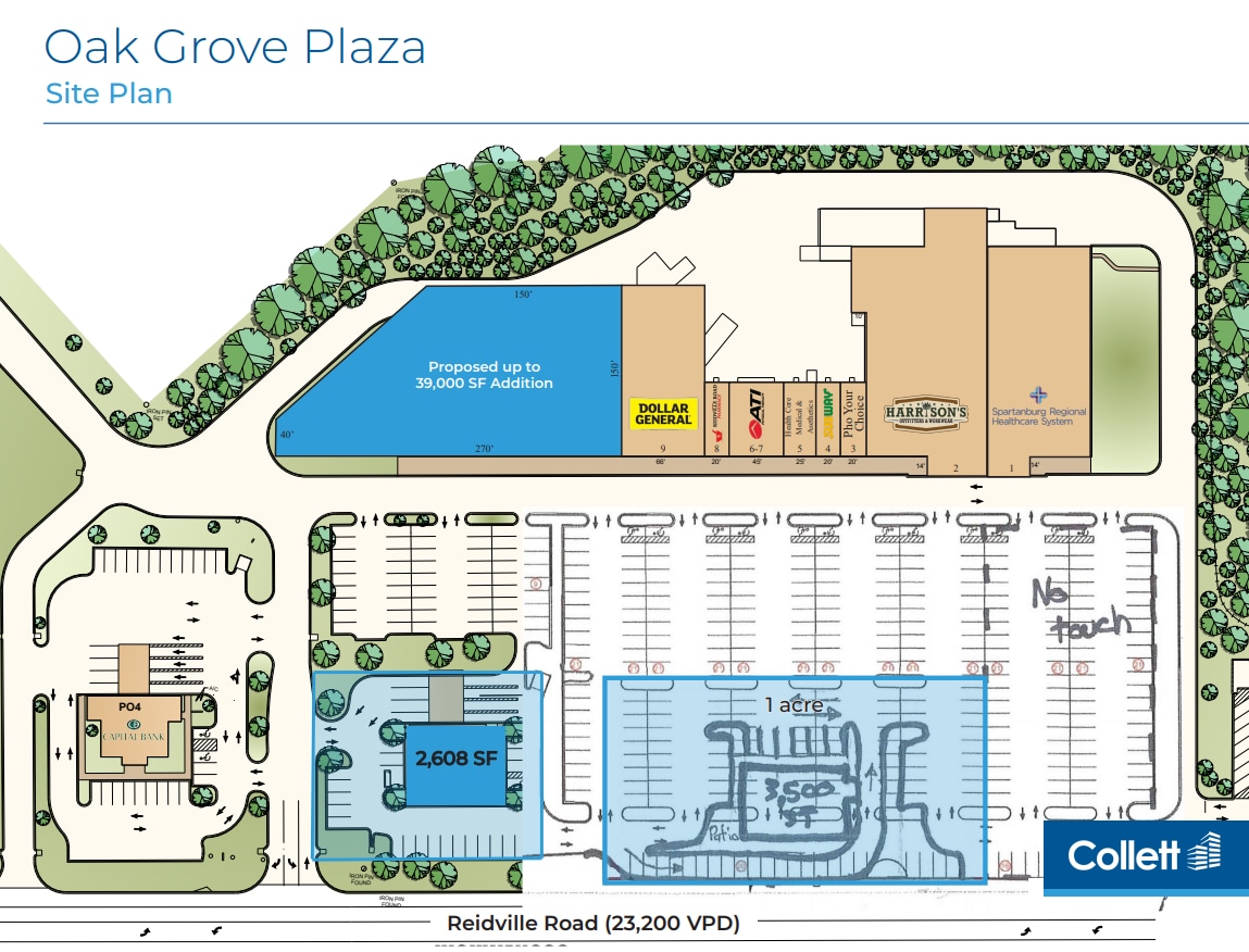 Oak Grove Plaza offers a prime retail leasing opportunity in one of Spartanburg’s most active commercial corridors. Strategically located at Exit 22 off I-26, the center provides excellent visibility from Reidville Road, which sees over 23,200 vehicles per day. The property features proposed retail spaces up to approximately 18,000 square feet, along with a 2,608-square-foot outparcel and an additional one-acre outparcel opportunity, making it ideal for a variety of retail, service, or dining concepts. The center benefits from strong co-tenancy and proximity to major national retailers, including Target, Costco, Walmart, Sam’s Club, and Academy Sports, all within the nearby W.O. Ezell Boulevard retail corridor. Surrounding tenants include Walgreens, Papa Johns, Dunkin’, Hardee’s, Tropical Grille, Domino’s, CVS, and Food Lion, ensuring consistent consumer traffic. With easy access to I-26 and close to major thoroughfares, Oak Grove Plaza is positioned to capture both local and regional shoppers. Demographics within a five-mile radius include a population of over 87,000 and an average household income exceeding $82,000, providing a strong customer base. High traffic counts on Reidville Road, East Blackstock Road, and I-26 further enhance the site’s visibility and accessibility. This is an exceptional opportunity for retailers seeking a high-traffic, growth-oriented location in Spartanburg.