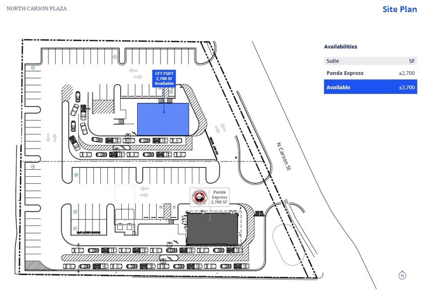 For Ground Lease. ±2,700 SF available, ±42,279 SF CFT lot size, 1 pad available adjacent to Panda Express, Drive-Thru available with close proximity to Carson Tahoe Hospital.