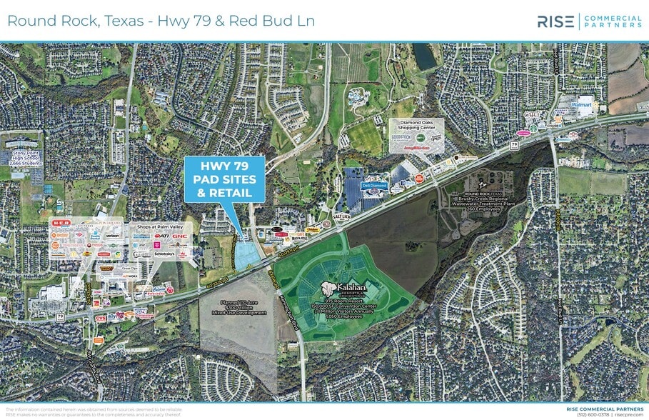 4,900 sf 1.6 AC Pad Sites Available • Site located in the middle of H-E-B Plus!, Dell Diamond, Kalahari Resorts Texas and a planned $300 million, 110 acre mixed-use development • Rare availability on Highway 79 with great visibility • Austin MSA's second fastest growing city: 33.3% population increase since 2010