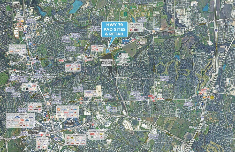 • Site situé au milieu de H-E-B Plus ! , Dell Diamond, Kalahari Resorts Texas et un projet de développement à usage mixte prévu de 300 millions de dollars et 110 acres • Disponibilité rare sur la route 79 avec une grande visibilité • Deuxième ville d'Austin MSA à la croissance la plus rapide : augmentation de la population de 33,3 % depuis 2010