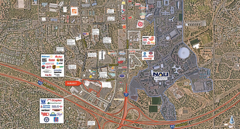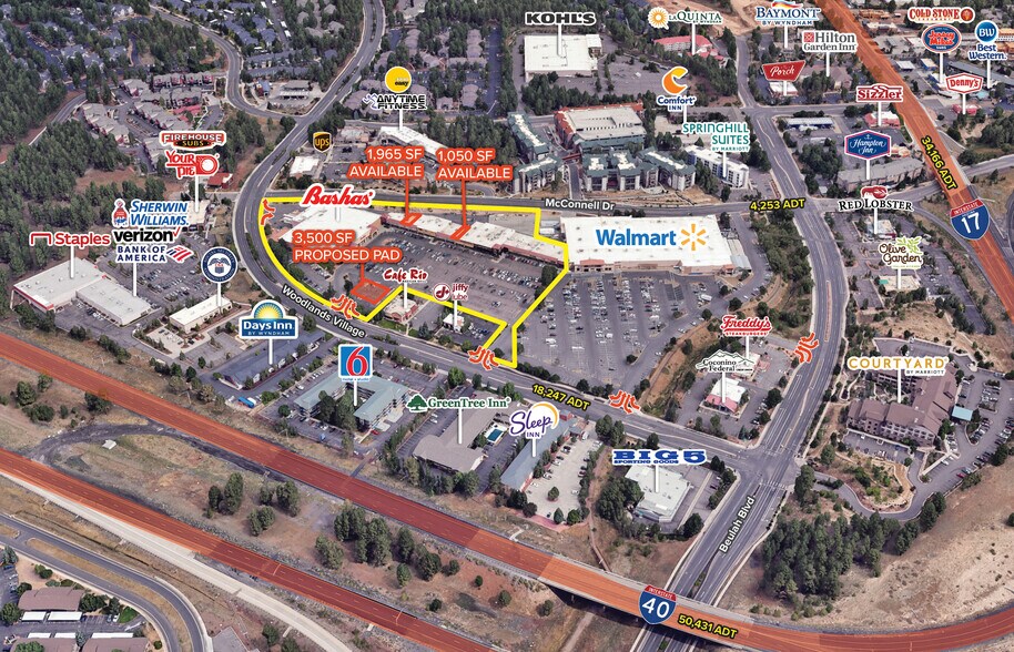 Coin SW de Beulah Blvd et McConnell Dr DERNIERS ESPACES DISPONIBLES - 1 050 pi² à 1 965 pi² EMPLACEMENT PROPOSÉ DISPONIBLE À distance de marche de l’Université de l’Arizona du Nord et des résidences étudiantes Accès rapide aux autoroutes I-40, I-17 et 89A/Milton Rd Centre commercial ancré par Walmart et Bashas Zone à fort achalandage