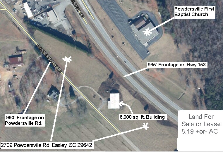 This is a fantastic opportunity for mobile home sales or other commercial ventures. The property features 8 acres of land with 900 feet of frontage on a major highway in Powdersville, South Carolina. The prime location and high visibility make it an ideal spot for attracting customers and growing your business. Whether you're looking to start a mobile home sales business or explore other commercial possibilities, this property offers great potential. Powdersville is a growing area with a thriving economy, making it an excellent location to establish your business. Don't miss out on this incredible opportunity. Contact a local real estate agent or visit online platforms dedicated to property sales for more information and to schedule a viewing. Act fast, as properties like this don't stay on the market for long.FOR SALE or LEASE 2709 Powdersville Rd. Easley, SC 29642 8 +or- Acres with a 6,000 Building on the Property Anderson County Tax# 2120004005 For Lease or Sale GREAT INVESTMENT OPPORTUNITY… 300’ deep with over 850’ road frontage on two MAJOR HIGHWAYS (See Arial Photo) with curb cuts on both. Where Greenville, Anderson and Powdersville ALL COME TOGETHER Great Location 8 +or- Acres On major highway 153 THIS PROPERTY IS EXCELLENT FOR Mobile home sales lot, storage units, car lot, equipment sales/leasing, Storage Containers, Industrial Use AND MUCH MORE… POINTS OF INTEREST ONLY 2 Miles from Powdersville Walmart (6 Minutes) Major Intersection/Shopping Center with Walmart, Chic fa lay OT (Convent Store) Walgreens and much more. ONLY 4.4 Miles from Highway 123 (Calhoun Memorial Hwy.) where all the Easley Walmart, Lowe’s, Home Depot, shopping and car dealerships are. Highway 123 Major highway from Clemson/Easley to Downtown Greenville. ONLY 6.8 Miles from I-85 (11 Minutes away) EXIT 40.
