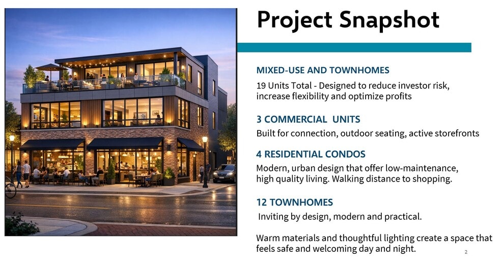 Ideal Uses: Mixed-use, townhomes, retail pads, small-format multifamily, or a phased development strategy