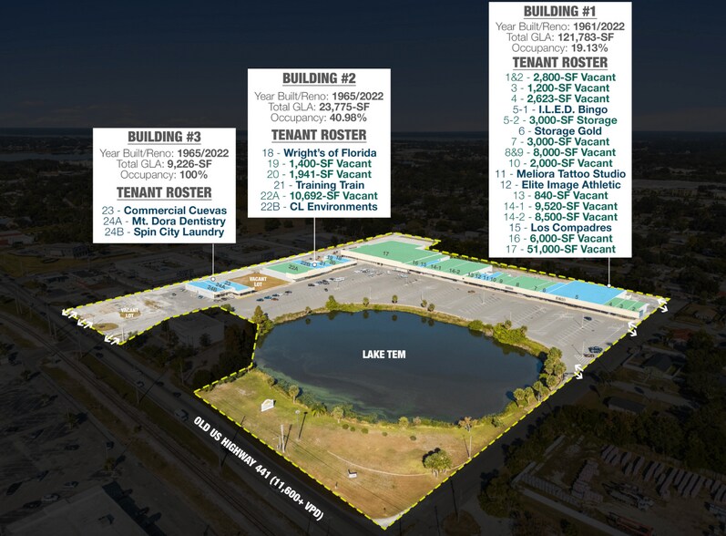 Disponible dès maintenant, espace principal de 51 000 pieds carrés. Peut être aménagé selon les besoins du locataire. Situé à moins de 2 miles du centre-ville de Mount Dora. Zonage commercial C-3, entrée signalée depuis l'autoroute 441, et grand stationnement disponible. Les options de location offrent de la flexibilité, avec des prix allant de 8,00 $ à 14,00 $ par pied carré. Profitez de certains des loyers les plus économiques de la région, tout en bénéficiant d'une grande visibilité et d'un fort achalandage sur l'ancienne US Highway 441.