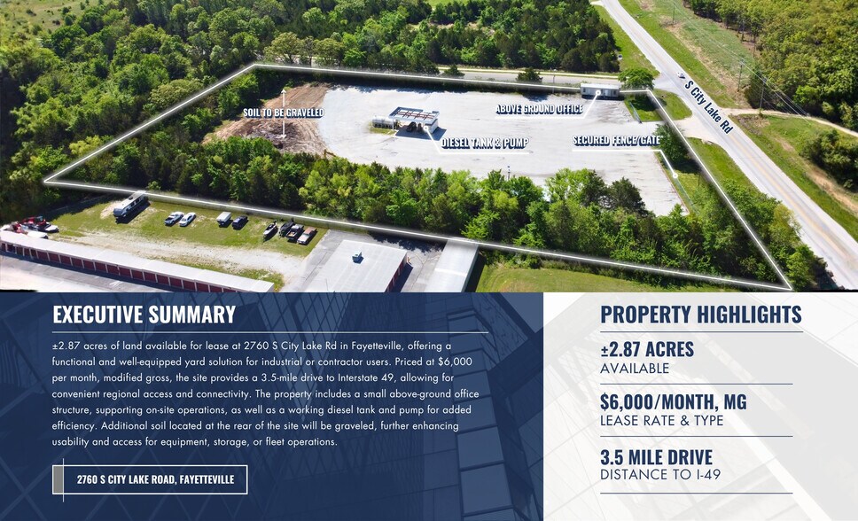 The property comprises approximately 2.87 acres located along S City Lake Road, approximately 3.5 miles from Interstate 49. It includes a gated perimeter with fencing and an above-ground office structure. A diesel pump and tank are installed on-site. The parcel includes a prepared gravel area for operational use. The site is situated within Fayetteville’s industrial corridor and provides convenient access to major highways and regional transit routes.