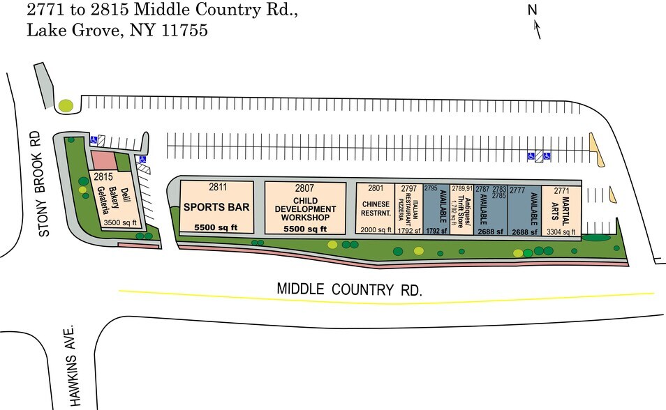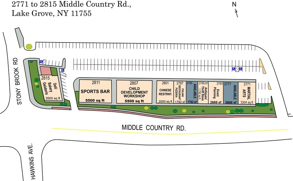 - Centre large et peu profond, donc beaucoup de façade sur Middle Country Rd.