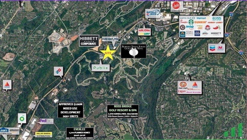 Publix-Anchored Retail Environment — Positioned adjacent to a top-performing Publix generating 754,000+ annual visits (Placer.ai), delivering consistent daily traffic, built-in customer demand, and strong co-tenancy synergy. Gateway to Ross Bridge & RTJ Golf Trail — Located at the primary entrance to Ross Bridge and the Renaissance Ross Bridge Golf Resort & Spa (345,000+ annual visits, Placer.ai). Captures steady traffic from residents, resort guests, golfers, and destination visitors. Strong Multifamily Growth Pipeline — A proposed ±900-unit apartment development within approximately two miles will significantly expand the daytime and evening population, driving sustained demand for nearby retail and service uses. Rapidly Expanding Residential Base — Surrounded by high-growth residential communities, including Ross Bridge and Everlee (2,344 planned homes, $300K–$870K+), providing an affluent and steadily increasing consumer base. Daytime Population Drivers — The Lakeshore Parkway corridor supports a 5-mile daytime population of 129,560, anchored by Hibbett Sports corporate HQ, Nebius AI Factory (300MW data center), FedEx Ground distribution center, Amazon distribution center, Lowe’s distribution center, Blue Cross Blue Shield data center at Jefferson Metro Park, and the Renaissance Ross Bridge Resort (259 rooms)