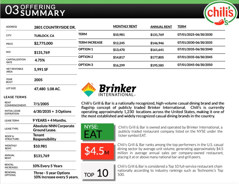 - Tenant has over 20+ Years of operating history at this location. Top performing Chili's in the region.