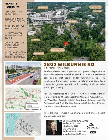 Positioned along the New Bern Avenue Bus Rapid Transit (BRT) corridor, now under construction, and located within a growing transit-oriented corridor. Minutes to WakeMed Raleigh, I-440, Downtown Raleigh, and Crabtree Creek Trail. Survey, maps, and concept information available upon request. Seller financing available.