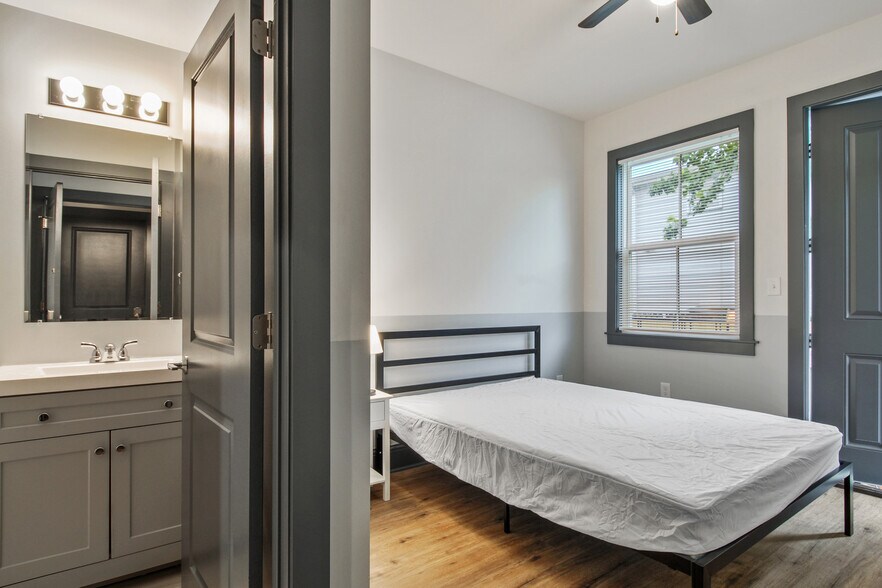 2808 – 2814 Philip Street in New Orleans includes two adjacent newly constructed residential buildings. The buildings encompass approximately 6,052 sf and are set up for shared housing/co-living. The property contains 18 bedroom-style units, eight units contain en-suite baths and ten units have shared baths (12 total baths). The property is divided into four flats – there are four kitchens and living areas shared by residents.