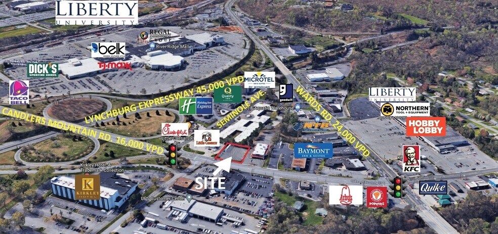 Ground Lease or Build to Suit - Property is located in Lynchburg's main retail hub surrounded by national retail and restaurant brands. The site has great visibility and is within walking distance to Liberty University, the nation's largest Christian University. Potential access to 2 signalized intersections and multiple means of ingress/egress. 140' of road frontage on Candlers Mountain Rd.