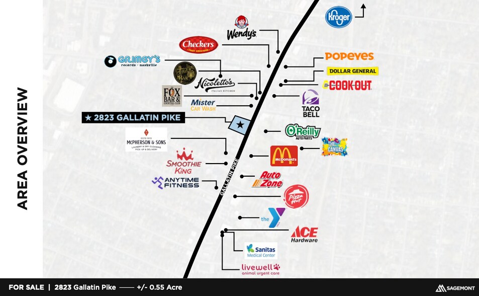 Situé au 2823 Gallatin Pike, au cœur de East Nashville, ce terrain d'angle de +/- 0,55 acre à vendre offre une visibilité exceptionnelle le long d'un corridor très fréquenté, avec environ 25 000 véhicules par jour. Entouré d'une solide combinaison de détaillants nationaux et d'établissements médicaux, notamment McDonald's, Wendy's, Taco Bell, Smoothie King, O'Reilly Auto Parts, Ace Hardware, Sanitas Medical et Ascension St. Thomas, ce site est idéal pour le développement d'un restaurant rapide (QSR), d'une banque, d'une clinique d'urgence, d'un magasin de pièces automobiles ou d'un commerce de proximité/dollar store. Les communautés multifamiliales à proximité, telles que The Canvas et The Flats at Laurel & Pine, offrent une clientèle intégrée, faisant de ce site une opportunité stratégique pour les promoteurs et les marques de commerce au détail à locataire unique recherchant un fort trafic, une grande visibilité et une cohabitation éprouvée dans l'un des corridors urbains les plus dynamiques de Nashville.