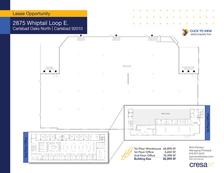 2875 Whiptail Loop E. offers a premier industrial flex opportunity within Carlsbad Oaks North, featuring 82,895 SF of modern warehouse and office space. The building includes ocean-views, outdoor patios, efficient loading, and a flexible mix of production, distribution, and office areas. With immediate access to I-5 and Hwy 78, this 2018 construction provides a rare blend of functionality, scale, and elevated coastal appeal. 1st Floor Warehouse: 66,895 SF / 1st Floor Office: 5,602 SF (Expandable) / 2nd Floor Office : 10,398 SF