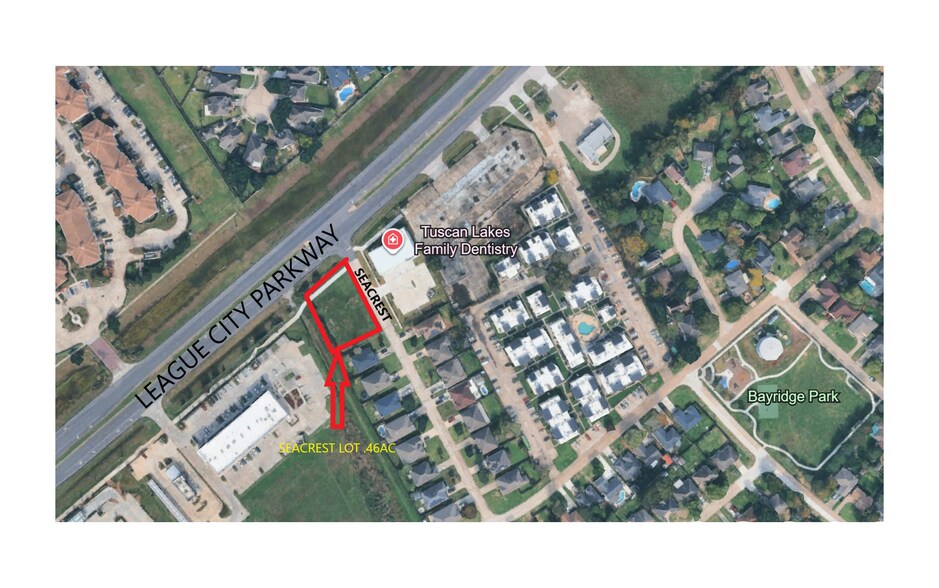 ±0.46-acre corner lot located at the highly trafficked intersection of League City Parkway and Seacrest Boulevard, positioned at the entrance to the Bayridge neighborhood and surrounded by the established communities of Tuscan Lakes and Marbella.