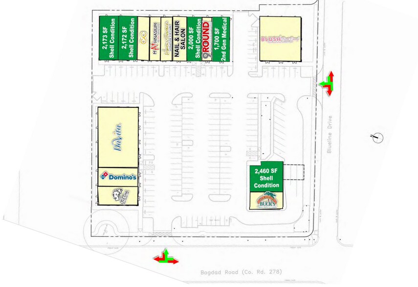 | Magasins | 7 | Rues transversales | Blueline Dr. |