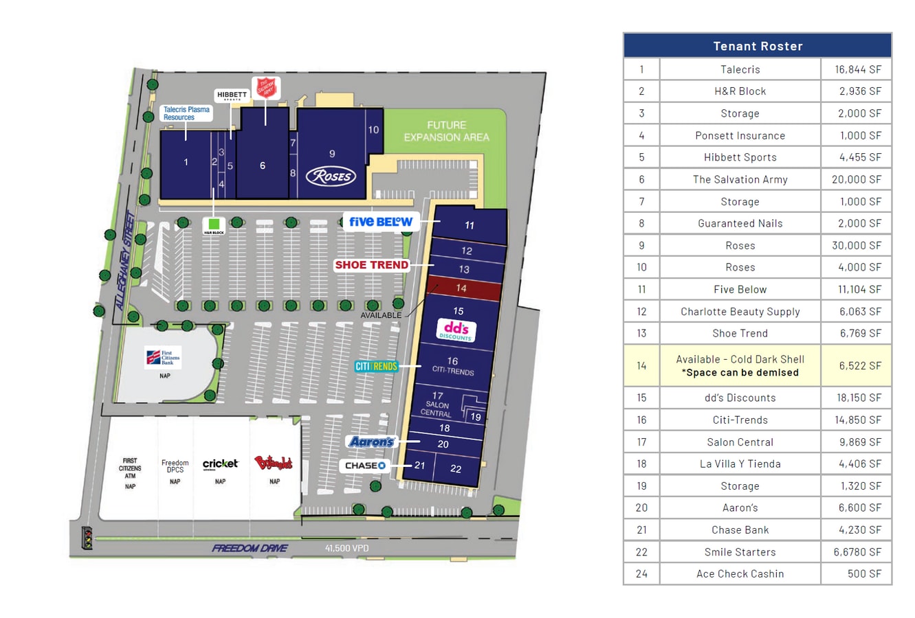 Situé à Charlotte avec un accès facile à l'I-85 (1/2 mile), à l'I-77, à la rue Morehead et au boulevard Wilkinson. 2 000 nouvelles maisons sont prévues ou en construction dans un rayon de 3 milles. Nombre important de places de stationnement. Nombre de trafic constamment élevé avec plus de 41 500 VPD le long de Freedom Drive.