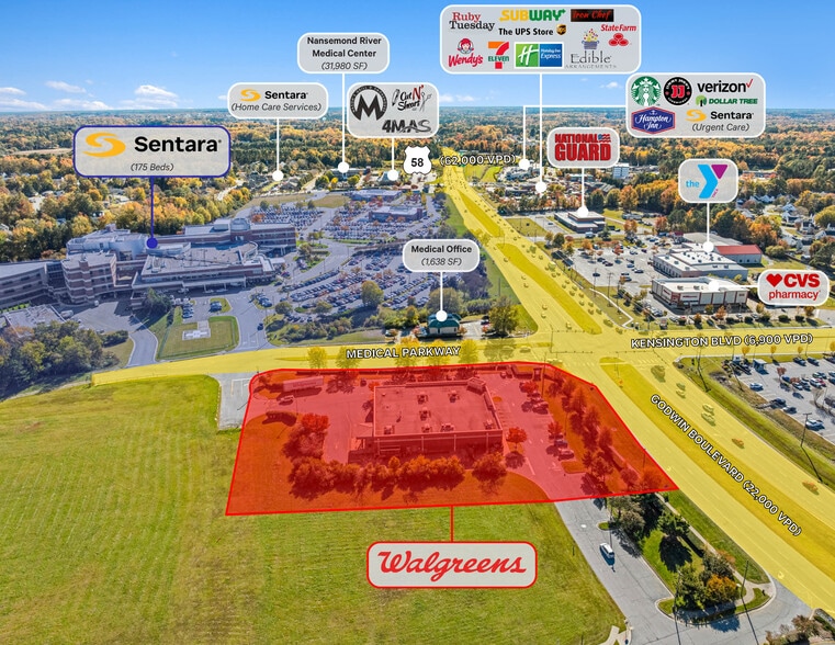 CBRE is pleased to offer for sale the 14,847-square-foot Walgreens positioned on 1.99 acres in Suffolk, Virginia — part of the broader Virginia Beach-Norfolk-Newport News, VA-NC MSA (Population: 1.8M+). Walgreens’ absolute NNN lease features ±6.7 years of firm term remaining with the potential for up to 50 additional years of term (see OM for more detail).