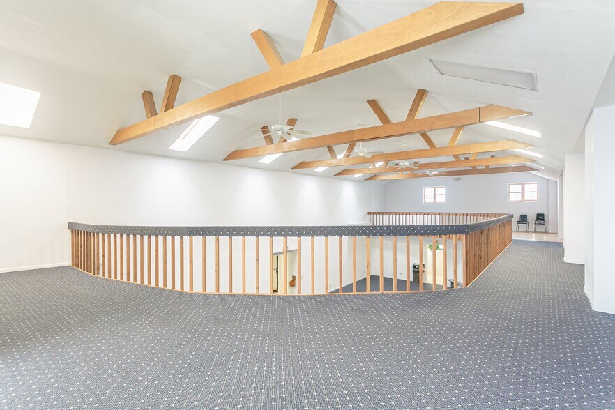 The floor plan allows great options for divisibility depending on size needed with multiple entrances. Large common restrooms are located on the west side of the building. The second floor space above the cathedral room is perfect for large meetings or gatherings. Formally occupied as a daycare, church fellowship, general office, and meeting space.