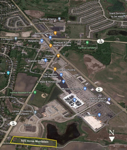5.02 Acres Most likely suited for residential development. New townhome development, Crossings of Mundelein, adjacent to the south. Mundelein Crossings retail center south at Route 83 and Route 60. No utilities. Access via gravel road from RT. 83