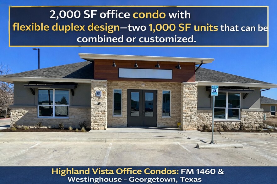 FINAL PHASE—get your office condo before they are SOLD out! 512-947-6400 Call/Txt KICK OFF THE NEW YEAR! GREAT OPPORTUNITY – MORTGAGE RATES EXPECTED TO DECREASE IN 2026 — GREAT TIME TO BUY BEFORE PRICES GO UP! Prime 2,000 SF Office Condo in Georgetown – Vista Office Park - Custom build to your business. Estimated Completion: 5–6 Months Temporary onsite units available during construction! High-visibility 2,000 SF office condo with flexible duplex design—two 1,000 SF units that can be combined or customized. Features 10’ ceilings, modern finishes, LED lighting, ADA restroom, kitchenette, reception, storage, 24-hour access, and 4 parking spaces per unit. Pre-wired for high-speed internet. Outstanding location with 400+ feet of FM 1460 frontage and easy access to IH-35 and SH-130. Perfect for medical, professional, or small business HQ. Kick off the New Year right—secure your office build today!