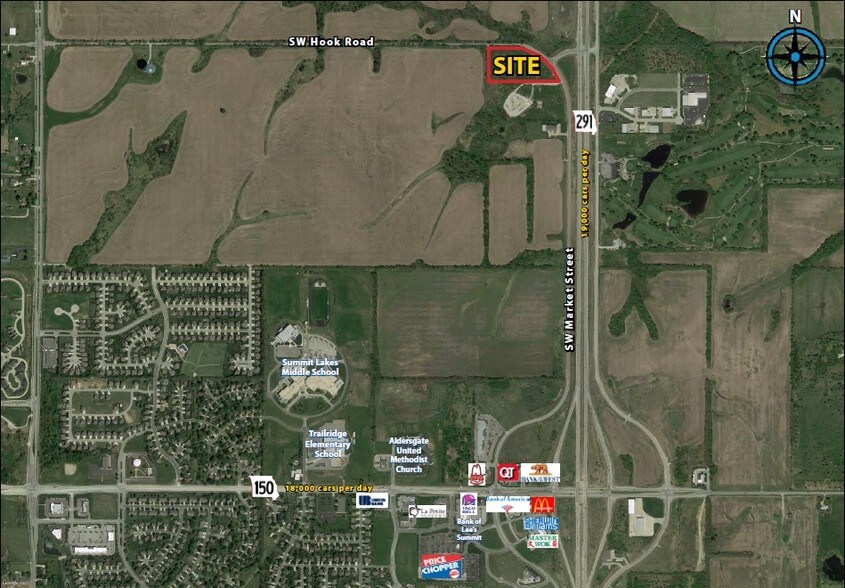 Located at the intersection of Hook Road and Market Street, this highly visible corner property offers excellent exposure to heavy traffic along Highway 291 South. Zoned CP-2 with an M-150 Corridor Overlay, the site is ideally suited for a variety of commercial uses. The property features approximately 715 feet of frontage on SW Hook Road and 212 feet of frontage on SW Market Street, providing outstanding accessibility and prominence.