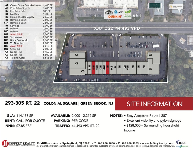Cet emplacement est dans la fleur de Green Brook, dispose d'un espace disponible de 2 000 à 24 000 pieds carrés. Colonial Square est une zone commerciale régionale de la route avec une grande visibilité. Les principaux magasins comprennent le Perkins Family Restaurant, Arthur Murray Dance, Harmon Face Values, Kid to Kid, H&R Block, Pool Tables Plus, One Main Financial. Contactez George Marogi appel/texto (201) 694-9054