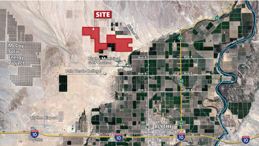 ¦ 1,230 contiguous acres ¦ Located north of Blythe just west of the Colorado River ¦ In the area of Mesa Verde, an unincorporated area and rapidly growing community ¦ Convenient location just off I-10 ¦ Just three miles to Blythe Airport ¦ Priced to sell!