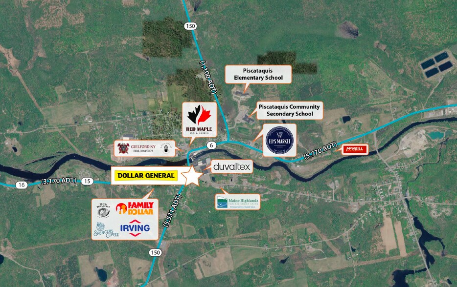 The property is located at the corner of Hudson Avenue and Main Street in the center of Guilford, a community in Piscataquis County along the Piscataquis River. The site benefits from a central downtown position with excellent visibility, and with the departure of the former Rite Aid, this Dollar General will serve as the primary convenience retail destination for the surrounding communities of Piscataquis County.