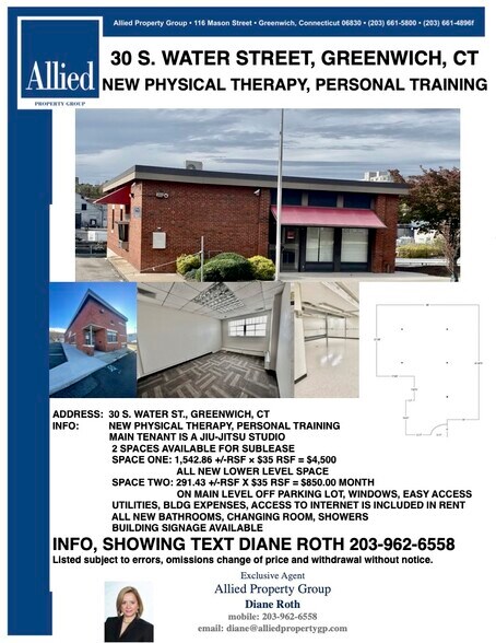 NEW PHYSICAL THERAPY/PERSONAL TRAINING MAIN TENANT IS A JIU-JITSU STUDIO 2 SPACES AVAILABLE FOR SUBLEASE SPACE 1 1,542.86 +/-RSF × $35 RSF = $4,500 LOWER LEVEL SPACE ALL NEW MOVE IN READY SPACE 2 291.43 +/-RSF X $35 RSF = $850.00 MONTH ON MAIN LEVEL OFF PARKING LOT HAS WINDOWS AND EASY ACCESS UTILITIES, BLDG EXPENSES, ACCESS TO INTERNET INCLUDED IN RENT ALL NEW BATHROOMS, CHANGING ROOM, SHOWERS BUILDING SIGNAGE AVAILABLE INFO, SHOWING TEXT DIANE ROTH 203-962-6558 Listed subject to errors, omissions change of price and withdrawal without notice.